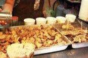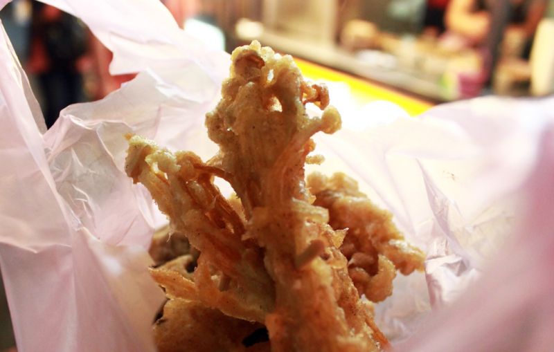 逛夜市最常吃的就是鹹酥雞等食物,這裡別於其他,只賣炸菇類,有杏鮑菇、鮮香菇、金針菇和秀珍菇,可以單點或是點綜合一次吃到4種不同菇類,百分之百全素食,對吃素的人來說,是很好的選擇。