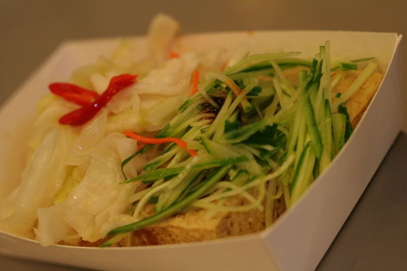 300度油鍋高溫酥炸的臭豆腐,外酥內嫩,搭配手工醃漬的泡菜和小黃瓜一口咬下,混著特調的中藥醬汁,一併在嘴裡交疊出豐富口感,清爽不油膩。