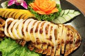 燒鴨是店內的招牌。上菜時,燒鴨皮的光澤與亮度吸引了目光,鴨肉肉質吃起來有韌性且不膩,到醉八仙海鮮一定要點招牌燒鴨!